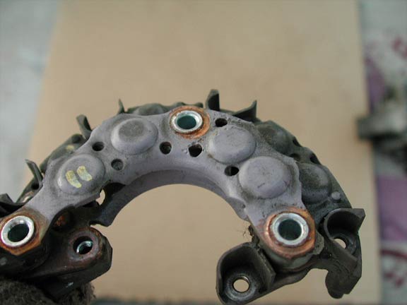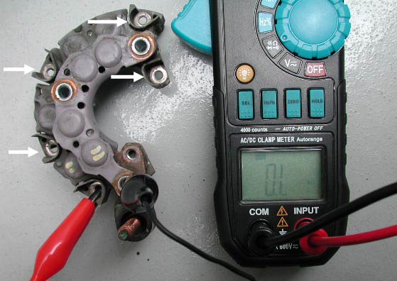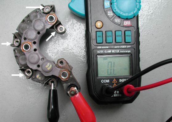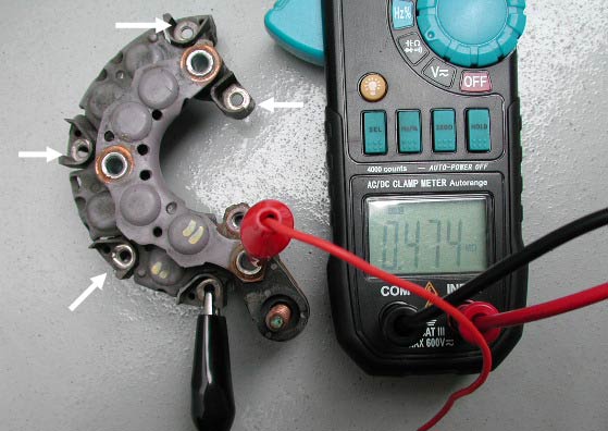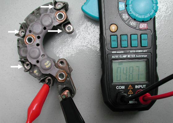 レクチファイアの異常の有無は、オルタネータを駆動させなくても把握することができる。それはテスターを使って導通をみること。下のように抵抗値をはかる。すると、矢印で示す部分も含めて0.47MΩ(470kΩ)程度を示す。なお抵抗値はレクチファイアによって異なる。
