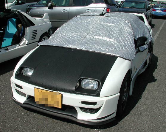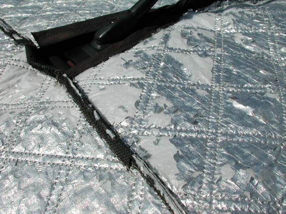 ハーフボディーカバーの目的は、キャビン内に直射日光が入るのを防ぎ、車室内の温度上昇を緩和することだ。本来の効果は十分に確認できているのだが、カバーの耐久性はどうか。最初に見せてもらった時から4ヶ月経過したのだが、なんと銀色の表面がかなり剥がれてしまった。