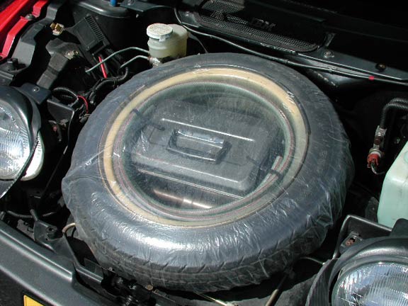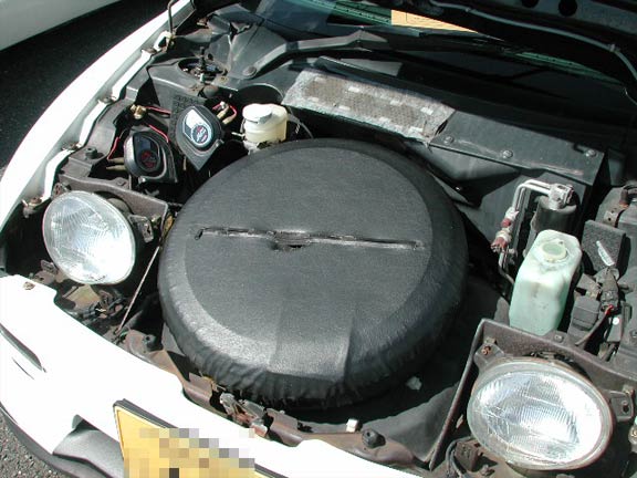 ボンネット下に移設されたスペアタイヤ。通常は室内用のスペアタイヤカバーが取り付けられていることが多い。が、これがすぐにボロボロになる。