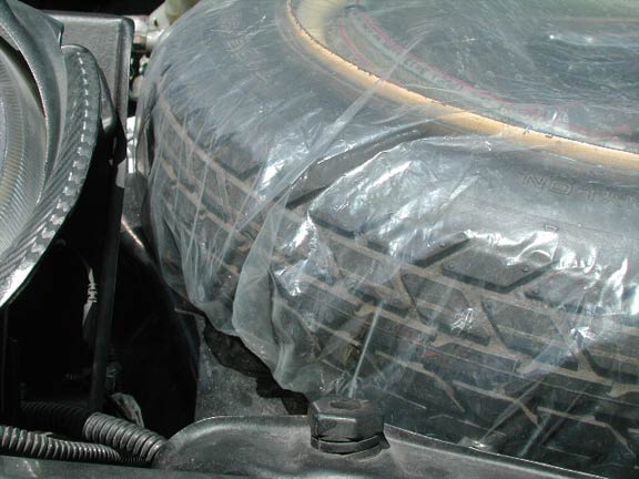 なぜかしらタイヤが白っぽく写っているなあと思ったら、ビニールが掛けられていた。新たなスペアタイヤカバーの登場である。