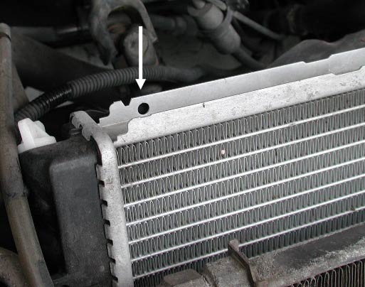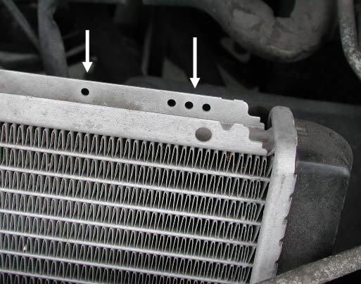 ここではラジエターに開けられている「穴」に着目する。下の写真は純正ラジエター。矢印部分に穴がある。