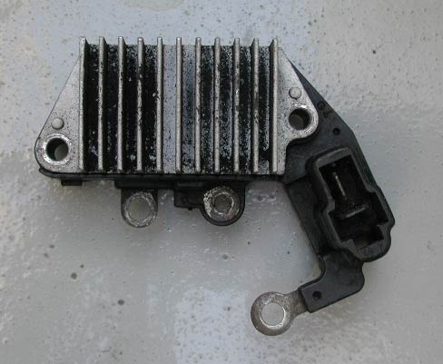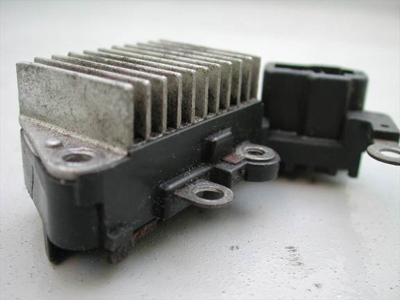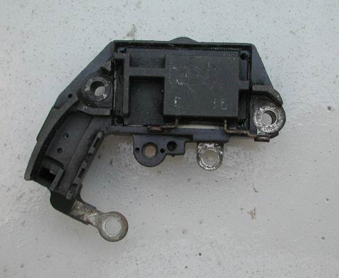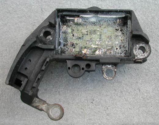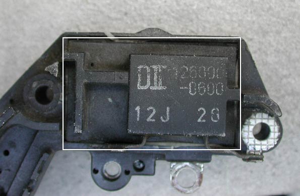 ネット上でいろいろ探してみたのだが、レギュレーターの中身まで分解した画像を探しきれなかった。ということは、これが世界初のレギュレーターの中身の画像になるかも? 中身を見るには蓋を取る必要がある。白い四角の部分をカッターで切ると蓋が取れる。この蓋は溶着とか勘合しているのではなく、単にシーラーで取り付けられているだけだった。よってカッターでシールを切ると取れる。