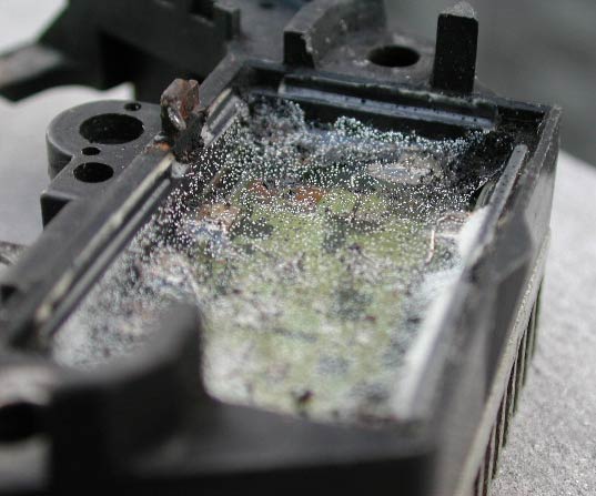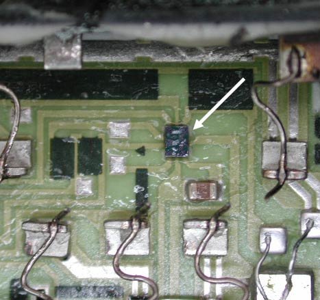 矢印で示しているのがIC。焼けたようには見えないが、これが壊れているのだろうか。