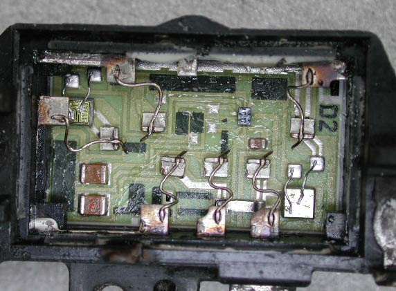 それにしても不思議なのが、熱を持つような部品が見られない点だ。複数ヶ抵抗が見られるが、いずれも数十kΩであり発熱するような物ではない。何のために大きなヒートシンクが付いていたりセラミックス製基板を使っているのだろうか。