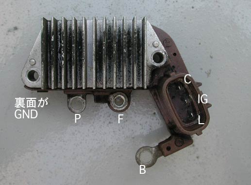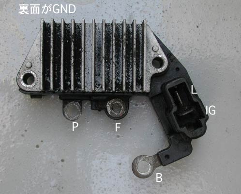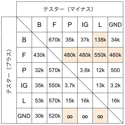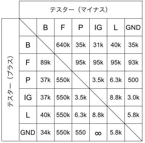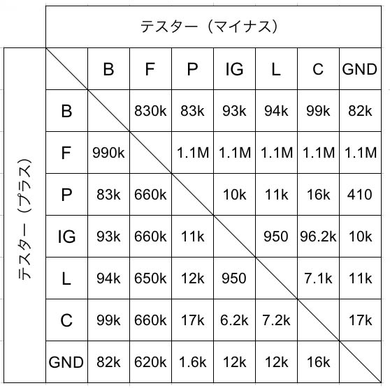 ここで示す端子間抵抗値測定結果は、黒いレギュレータ(IGとL端子しかない方)のみの結果を示す。前頁で示す割れたレギュレータの結果を示せればよかったのだが、あいにく正常品を持ち合わせていないため、黒い方のみの結果を示す。
