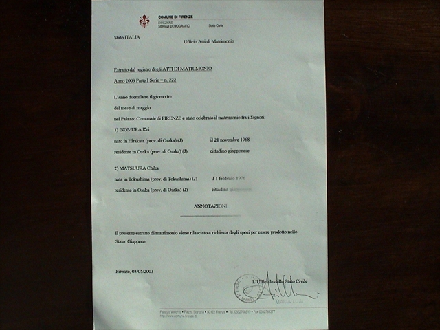 後日、この結婚証明書を添えて婚姻届を提出、戸籍に「イタリア共和国方式により婚姻」と記載された。