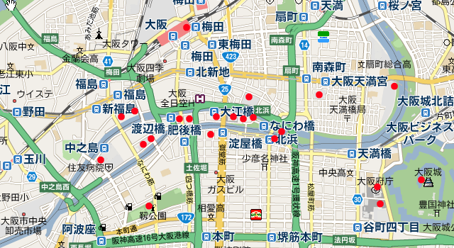 御堂筋を北に上ると梅田地区があり、●「JR大阪駅、阪急、阪神、地下鉄(3線)」のターミナルがある。