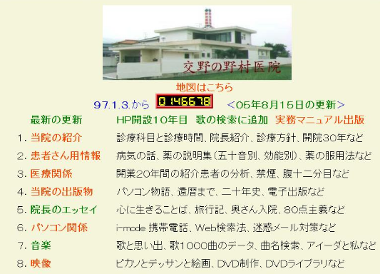 最後に、今から5年ばかり前の、旧野村医院のサイトのトップページを供覧する。開設して10年目に入ったところで、この日を以って息子に医院を引き継ぎ、サイトも閉鎖した。このトップページのスタイルは、開設以来ほとんど変わらず、現在のサイト「中之島のBOW」のトップページにも、引き継がれている。現在のトップページの方が、使いやすくなり、少しだけ洗練されたように思うが、主観的な感想であろうか?