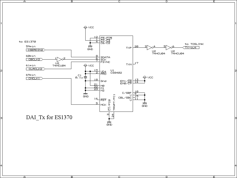 これで、ES1370の.WAVファイルの出力I/Fには、CS8402をお勧めできます(^^;;; 他に必要なものは、74HCU04とパスコン、出力のためのTOSLINKだけです。