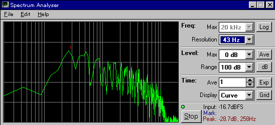 全く同じ箇所を再生している訳ではないのですが、ES1370の場合は、10kHzより高い周波数はばっさりと切り取られてしまっています。 YMF724の場合はきちんと20kHzまで周波数特性が延びています。 ということで、耳で聞いた感じだけではなく、スペクトルを見てみても、YMF724のMIDI出力の良さがはっきり認識される、という結果になりました。 ですから、ES1370でのMIDI出力をあまり追求する必要はなさそうです(^^;;;
