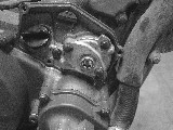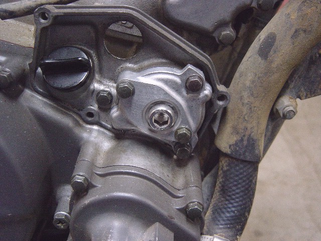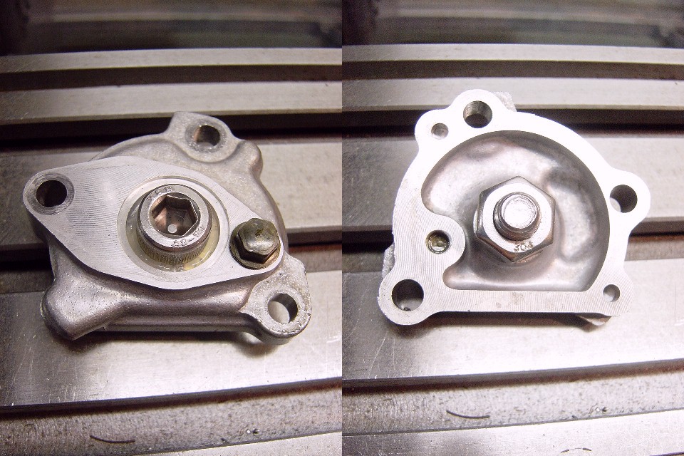 | 分離仕様から混合仕様に変更するためオイルポンプを取り外します。 内蔵されているプラスチック製のギアASSYを取り外し、シャフトが貫通していた穴をシリコンを塗布したネジで埋めます。 本来ならば専用の部品が有るようですが とりあえず「オイルが漏れなければよし」ということでこの場をしのぎます。もしも不具合が有るようならそのとき再度検討します。 |