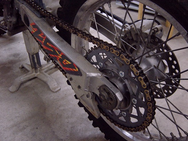 | アファームのノンシールチェーンを装着します。 以前より使用していますが、あんまり延びもなく値段の割には優秀な気がします。 スプロケットのフロントはスズキ純正13T、リヤはアファームの47Tが付いています。 チェーンアジャスターの位置は0+1の所でほぼF・Rスプロケット間が最短の距離になる感じです。 クリップはタイヤ側に正転方向ではずれない向きに取り付けます。 |