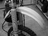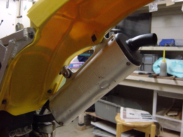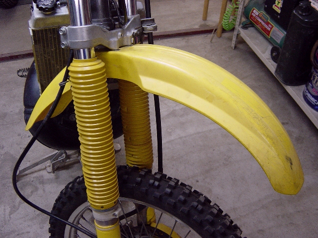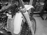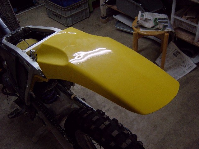 Fフェンダーを取り付けます。とても傷が目立ちます。前から見たところと後ろから見たところでは、フェンダーの新旧でなんかアンバランスです。1レースでも参戦すれば気にならなくなるでしょうけど。 |