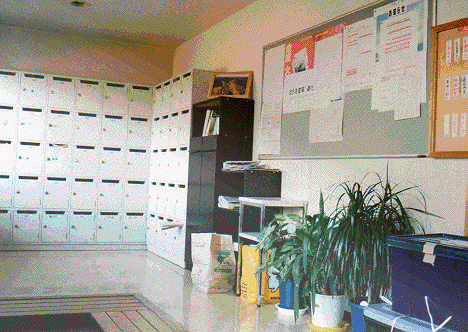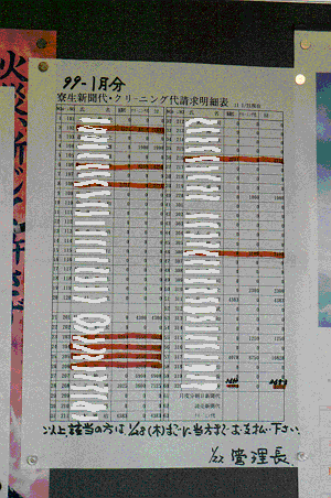 | 玄関の掲示板。新聞代とクリーニング代は月末にこの請求表を見て支払う。しかし、シャツ1枚のクリーニング代に300円懸かるというのは如何に考えても値段が高い。寮生にとっては憂慮される問題である。 |