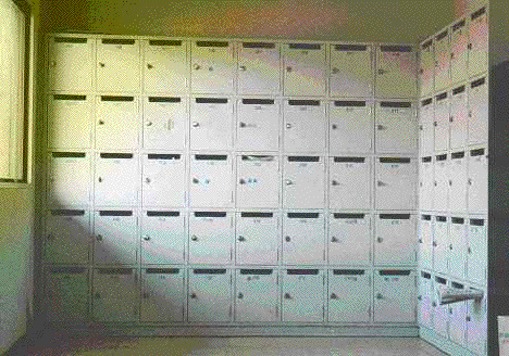 | 下駄箱もこうして対峙して見てみると、何かストイックな美を感じさせる。が、この下駄箱一つ一つに男どもの汗と油にまみれた靴が入っている事実を思い出した時、そのような感傷も吹っ飛んでしまう。 |