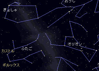ふたご座はカストールとポルックスの双子で、兄カストールは乗馬の名手、 弟ポルックスは剣とボクシングの名手で不死身でした。ある戦いでカストールが死んでしまった後、 ポルックスは一人で生き残る事をよしとしないで、大神ゼウスに願い出て不死を解いてもらい、 兄弟共に星座に置いてもらったといいます。