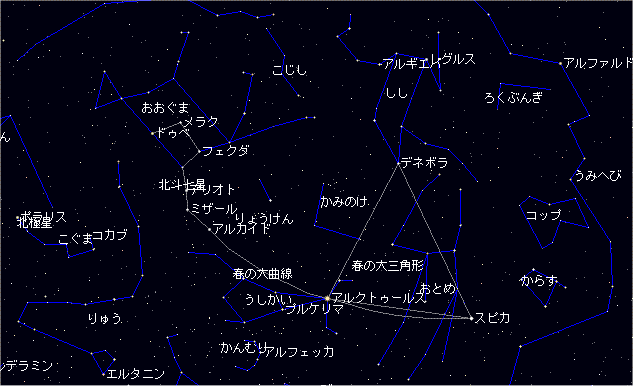 春の空は暗い星が多く、また春の霞(かすみ)であまり見えないので星を探すのは少し難しいです。 今度は北斗七星の柄杓(ひしゃく)の持つところを使います。北斗七星の持つところ(柄:え)を、そのカーブにそって伸(のば)ばしていくと明るい星に ぶつかります。これがうしかい座の一等星アルクトゥ〜ルスです。 これをもっと伸ばすとおとめ座のスピカにぶつかります。これを春の大曲線と言います。