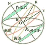 さて、黄道は太陽の通り道を表しています。 観測者が地球の中心にて地球と言うスクリーンに星が投影されている天球で考えますと、 赤道円と2点で交差(AとB)する大円となります。