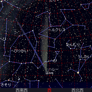 場所は地図帳がどこかに行ってしまったので 奈良市とします。実際は飛鳥ですが大差ありません。ハレー彗星の出は21時11分、南中は5時31分 、薄明開始は3時15分です。