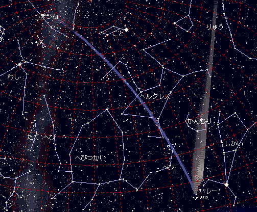 日本書紀の天武12年9月と言いますと現行暦での687年10月17日からの1ヶ月になります。 この季節になると、尾の長さが天の一方に達したと書いてあります。ただし10月ですと金星軌道の内側の向かいますので尾は長くなりますが、 太陽に近くなってしまい昼間で見えないことと、夕方チョット見えても 彗星を斜め後方から見る形になりますので、 見た目は小さくなってしまいます。