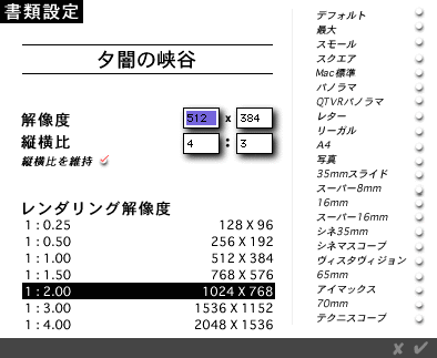 ここで「ファイル」メニューの「書類設定」を選び、レンダリング解像度を自分の好きなサイズに変更する。ここでは私のMacのデスクトップのサイズ、1024×768に設定した。