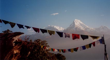 この写真は、ゴレパニ(Ghorepani)とプーン・ヒル(Poon Hill)の途中から見た、アンナプルナだそうですが、アンナプルナには六つくらいの頂きがあり、そのうちどれかは分からないとのことです。手前の旗は、チベット密教の経文旗(Tibetian Prayer Flag)だそうです。