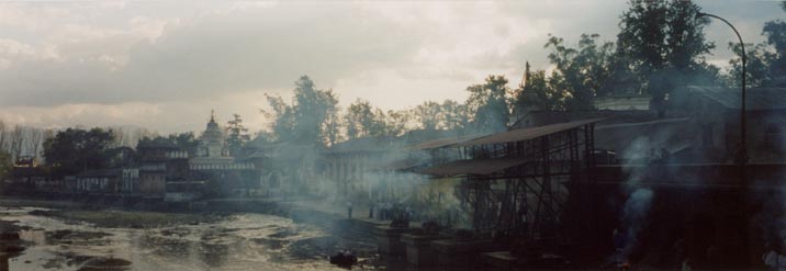 煙は、四つの火葬場から立ち上っていたそうです。この近くで人が死ぬと、この寺院で火葬に付されますが、台の上に薪(まき)を積み重ねてその上に遺骸(いがい)を乗せ、さらに薪でその上を覆って近親者が点火するそうです。ただ、火を付け終わると家族は、見守ったり、祈ったりすることも、涙を流すこともなく、帰ってしまい、そのあとは寺院の係りの人が火を守ったあと、灰を川に流すそうです(この話と左の写真は1976年に書かれた、Guides Bleus - au Nepal, Hachetteによるものです)。