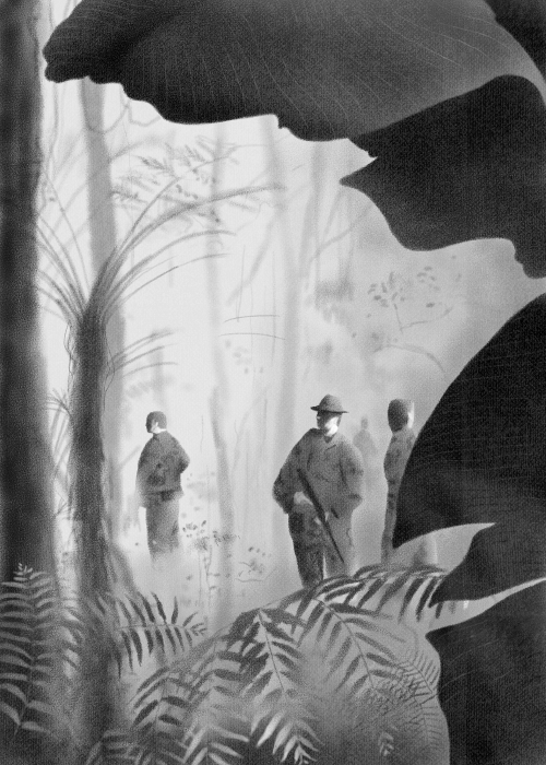 「鬱蒼とした森が舞台」というのが編集者の希望。とにかく「鬱蒼」とした雰囲気を出す為には密度濃く、植物を大量に描く・・。大変な作業でしたが高評価を頂いた絵です。→関連リンク