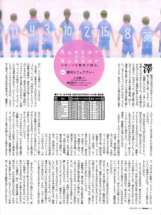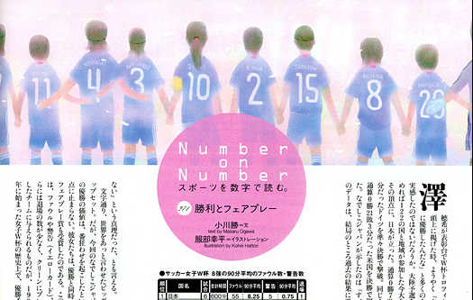 Number誌で長期連載中、小川勝氏のコラム挿絵。横長サイズで、描いていて面白い仕事でした。毎回色々なスポーツを数値で取り上げています。