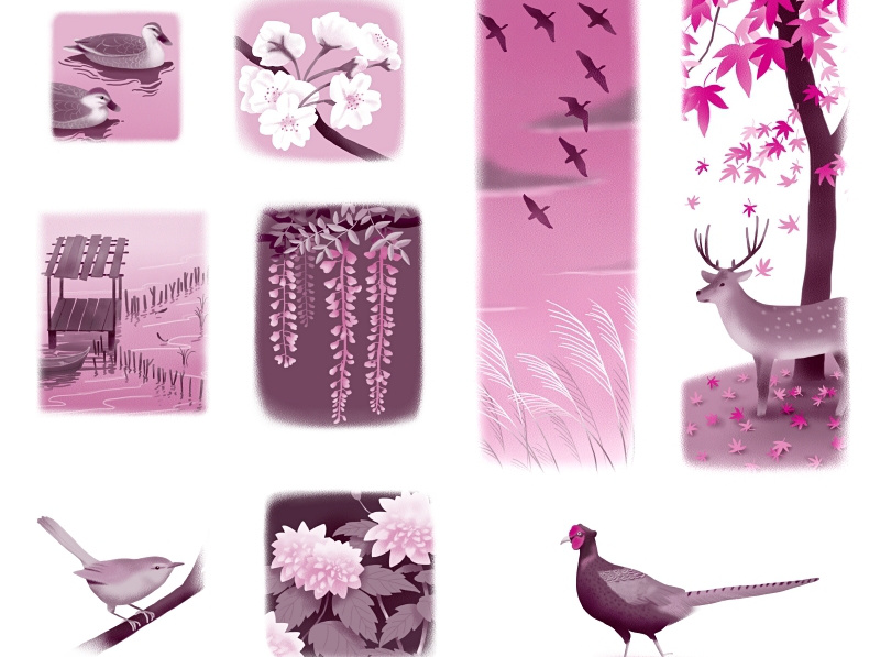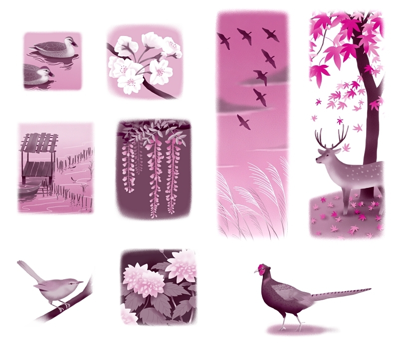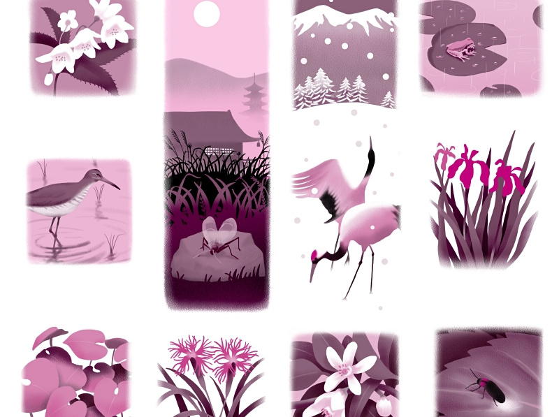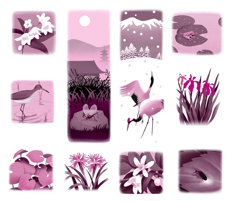 解析古典文法(各章ごとの扉ページ)(画像クリックで拡大) 【各章扉絵1】 古典の世界で季語となるモノが決まっています。 各章ごとの扉絵では編集部から要望のあった項目を季節ごとにまとめて描いています。 各章4点、七章で28点を制作しました。ちなみに仕上がりはM+Kの2色印刷。 【各章扉絵2】