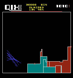 | 解説 | マーカーを操作してフィールドを囲み、自分の陣地を増やしていく陣取りアクションゲーム。 各面に設定された規定パ−セントを超えるエリアを確保すると面クリアとなる。 確保した陣地を這い回る自機のスパ−クと、フリ−の画面内を動く敵のクイックス。 スパ−クは常に前に地形を進むので線引きをしてやりすごし、囲んだ領地はクイックスのいない側の領地が確保される。 そのゲーム性は非常に完成度が高く、その後類似ゲームが多く排出された。 |