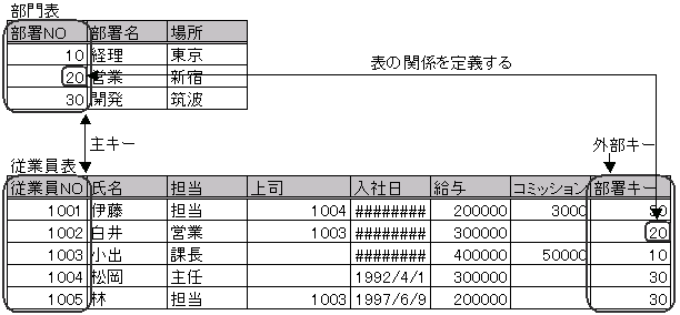 データが格納されている物(部門表、従業員表)