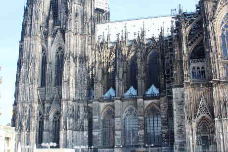 専用バスで9時出発。ケルン大聖堂に。2001年にケルンに来たが当時は物乞いの人が見られ治安が悪いといわれていたが、そのような風景は無く人々の往来も賑やかで、我々はSさんの案内で大聖堂の周囲を一巡りし大聖堂の外観を見学。