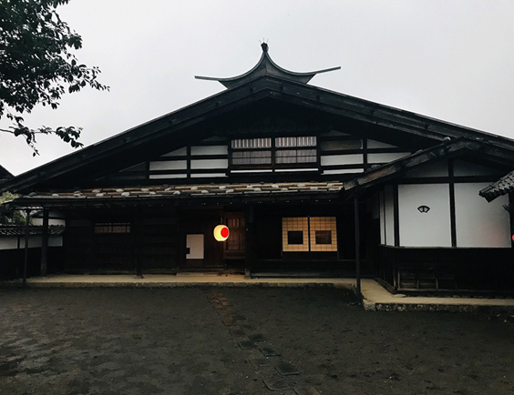 建物は南面し、桁行、梁間とも約10間で、屋根は切妻造、板葺きにて 妻を正面に見せます。 |