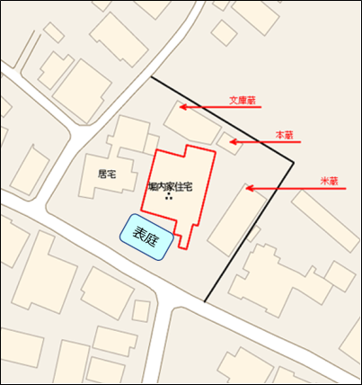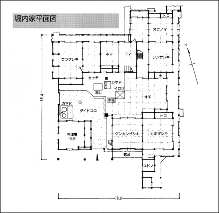 現状における間取りの大略は、表・中・裏の3列に区切られ、表の列は上手(東)から2室続きの座敷と土間、 |