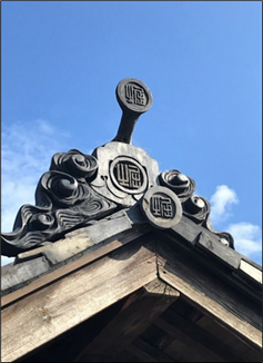 昔ながらに石を置いた長板葺きの緩やかな勾配の妻入り屋根に、棟飾りの「雀(すずめ)踊り」がついています。 |