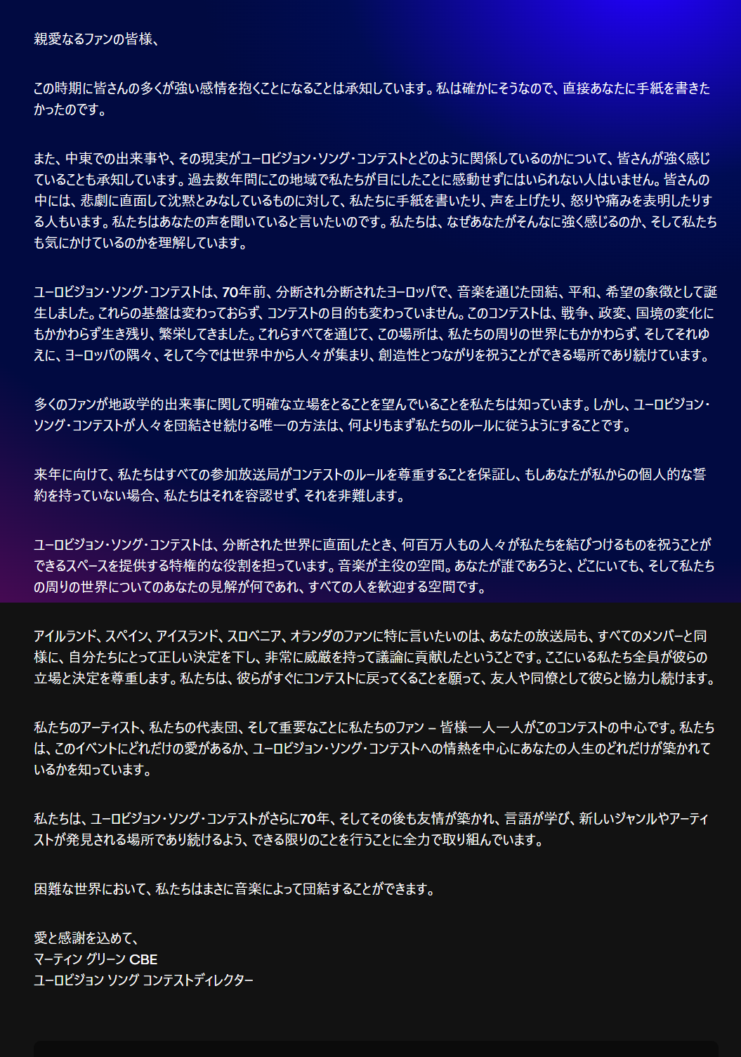 大会ディレクターのマーティン・グリーンが11日にユーロビジョン・ファンに向けたメッセージを発表しました。 参考のため、日本語に自動翻訳したスクリーンショット(PNG画像)も掲載します(Operaブラウザに組み込まれた自動翻訳を利用しています)。 LETTER TO OUR FANS FROM MARTIN GREEN https://www.eurovision.com/newsroom/letter-to-our-fans-from-martin-green/ LETTER TO OUR FANS FROM MARTIN GREEN の日本語訳(Operaブラウザの自動翻訳によるスクリーンショット) 画像ファイル message_from_martin_green.png [文責 良石 (written by Ryouseki), ESCfun@JPN]