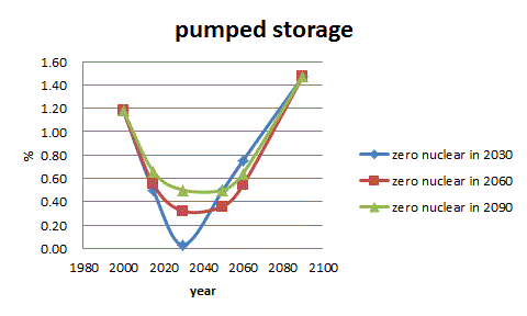 最小需要日の需要の落ち込みが大きいため、原発を一定の負荷で動かす限り、全ての火力発電を停止させても発電量が最小需要曲線を越えてしまいます。このた め蓄電装置が必要となります。蓄電装置のなかで一番コストが低いのは揚水発電です。余剰電力で水をくみ上げ、週日の昼間のピーク需要にそなえます。