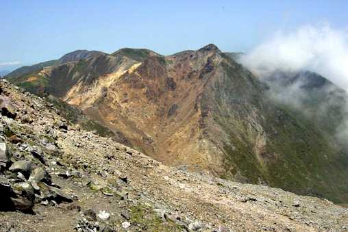 北西方向には鞍部にある峰の茶屋跡避難小屋と登山者を見下ろせる。鞍部と朝日岳の間にある剣が峰(1,799m)の当面 に朝日岳にゆく登山道が見える。我々はこの難ルートは採用せず、鞍部より三斗小屋温泉に下る予定である。三斗小屋温泉方向の一山越えた谷間にはかってジー プで奥只見周遊のときさまよった田島町があるはずである。