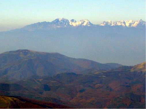 登山路ではずっと浅間山を中心に右手に特徴のある荒船山と御座山が見え ていた。御座山は小海高原から見ると頂上部は岩盤でクライマーを刺激する姿をしている。そして浅間山の左手に湯の丸高原、四阿山がはっきりと見え る。その向うに横手山、岩菅山、本白根山が一体となって見えるが判別できない 。山頂の360度パノラマによれば本白根の右に前回登った苗場山があるはずだが、霞のなかに消えている。