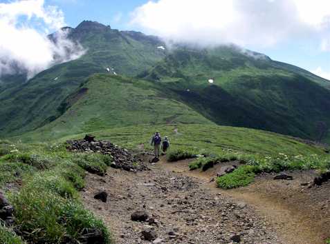 昨日は新山(2,236m)に登らなかった代わりに七高山(2,229m)に登ろうと 御室小屋を6:00発。いったん火口底に下り外輪山に登る。