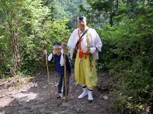 登ってくる講のなかで数%の人が完璧な山伏の白装束を着用している。息子を連れた山伏がいたのでお願いして写真を取らせていただいた。昨日在った五十日行 をしている山伏と同じ黄色ではあるがこちらは袴が黄色い。何故かと 聞くと修験道には三本山があり、寺院毎にデザインが微妙に違うのだという。三本山とは醍醐寺・聖護院・金峰山寺である。