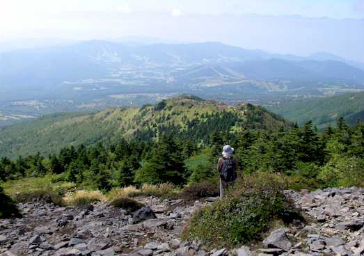広い尾根を下ってゆくとやがて中四阿が見え始める。長大な尾根がそちらに向かってくの字に雁行している。中四阿は上面が岩場になって裸地となっている。