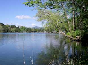 次ぎは松原湖に立ち寄る。小さな池といってもよい水溜りだ。観光地としてはうら寂れている。遠くに見える山が茂来山であ る。