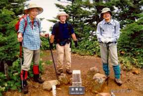 登りなおして狭い尾根をドンづまりまで行けば、そこが裏志賀の山頂だ。志賀高原の神様はここに鎮座しているようだ。その前で記念撮影。