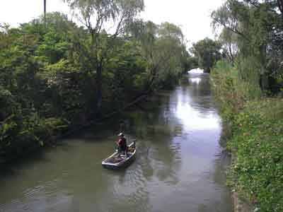 オランダ村をでてしばらく行くと手繰川が印旛疏水路(新川)に流れ込むところで釣り師が鏡のような川面にバッテリー推進器をつかってゆっくり船を操って釣