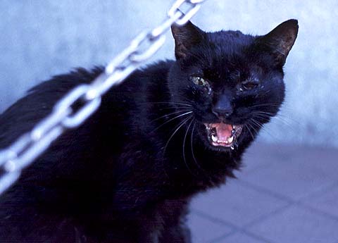 近所を散歩していて道路脇に座り込んでいる黒猫発見。 呼びかけると近寄ってきてニャーと応えたが、見ると両目とも 激しく傷ついている様子。ケンカに負けでもしたのだろうか。 ばさばさの毛並みをよしよしと撫でてやる。