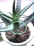 うーむ、実は、寒さによる葉の衰弱は、すばやくカットしたことで緩和されたのですが、月曜日にちょっとショックなことがありました。実はアロエの鉢に事故があり、カットするつもりのなかった葉が、茎近くから二センチを残して「もげて」しまったのです(左が証拠写真です。目を凝らしてご覧ください。無惨な姿がおわかりいただけるでしょう ^^;