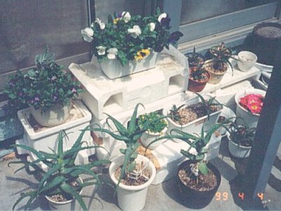 これからの課題は、冬でも夏でも外に置いておける、しかもできれば一年草ではない花や観葉植物を中心に購入、手入れをすることです。アロエやポトスだけが増えていくのは、冬を考えるともう怖くてたまりません。ただでさえ部屋は本でいっぱいです。しかもポトスは冬は寒さに弱く、夏は直射に弱いので、春と秋しか日向におけないというシロモノ。これからもっともっと勉強して、庭を中心に楽しめる植物を考えたいと思います。