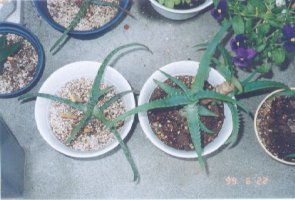 植え替えの注意: 鉢が小さくなったら、4月頭から初夏、どんなに遅くても8月くらいのあいだに 大きめの鉢に植え替える。その際、根を3分の1くらいカットすると水分を吸収 しやすくなる。 根元に出てきた芽が大きくなったら(←葉が最低でも6〜8枚以上)挿木にして 鉢に植えることができる。遅くとも8月までにやることが望ましい。 また、葉を使いすぎて、上部にばかり葉が残って茎があまりにもひょろ長くなっ てしまったら、葉がたくさんある先端の部分を残して挿し木にすることもできる。 ただし、この場合は茎が若返ってしまうので、数年で開花するはずのアロエの花 を見るには、また数年を待たなければならない。花は見たくないが葉が使いたい という人向け。こちらも、遅くとも8月までにやることが望ましい。 挿木の場合は、土に挿してから3週間くらいのあいだ、割り箸とビニール紐など で軽く固定させてやる必要がある。割り箸のみでもよい。割り箸をはずしてから も、鉢の移動などで乱暴に取り扱うと、出てくる根が鉢になじまない。しばらく は注意。根が出る前に水を与えては悪影響なので、10日〜2週間くらいは水を 与えない。そのあと少しずつ与えるようにして、一ヶ月くらいしたら、通常の量 にする。 根が出る直前ころ、いったん元気がなくなる。もう枯れてしまうのかと思うほど だが、その時期を過ぎれば元気になるので、慌てないで様子を見る。